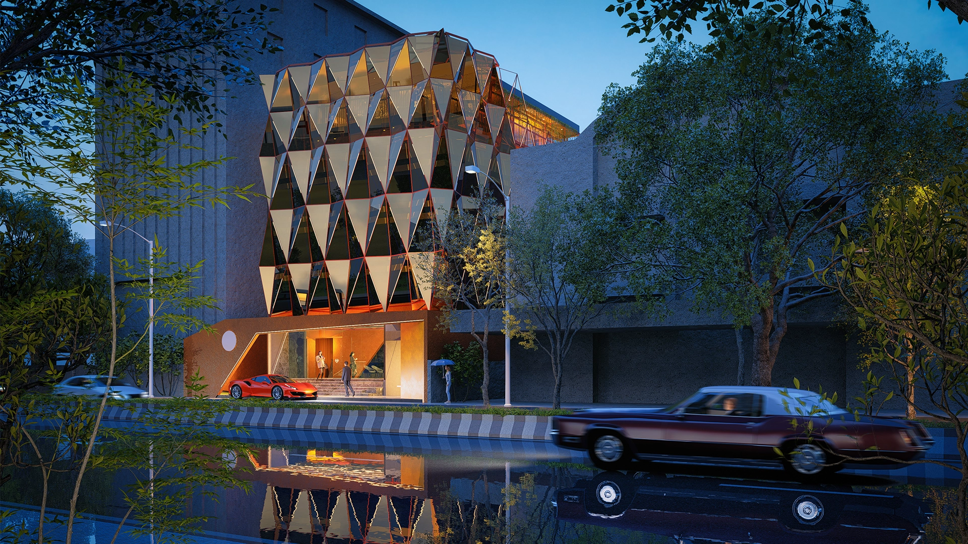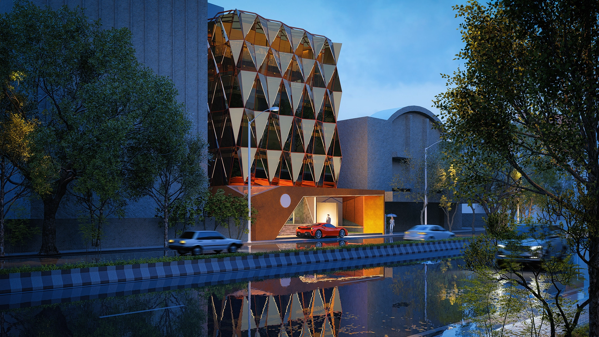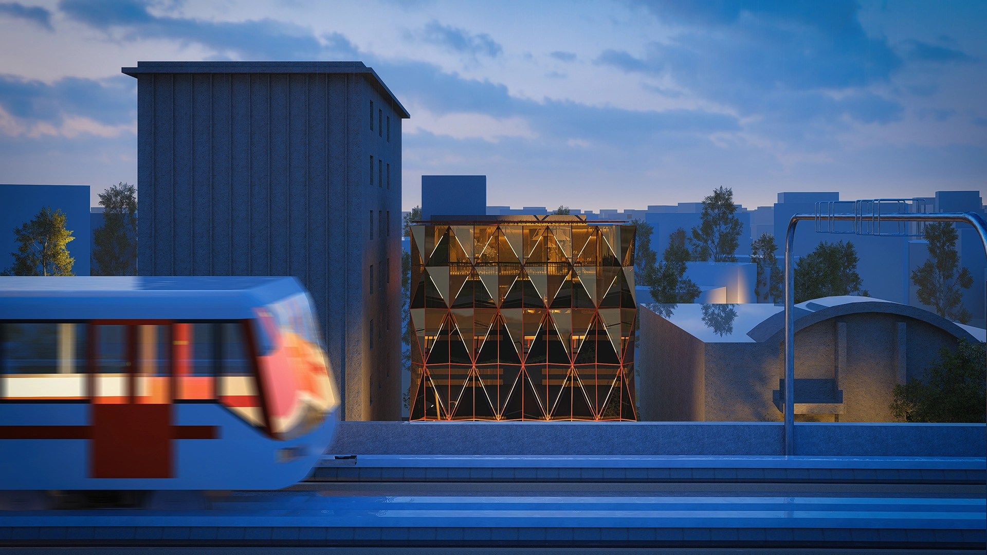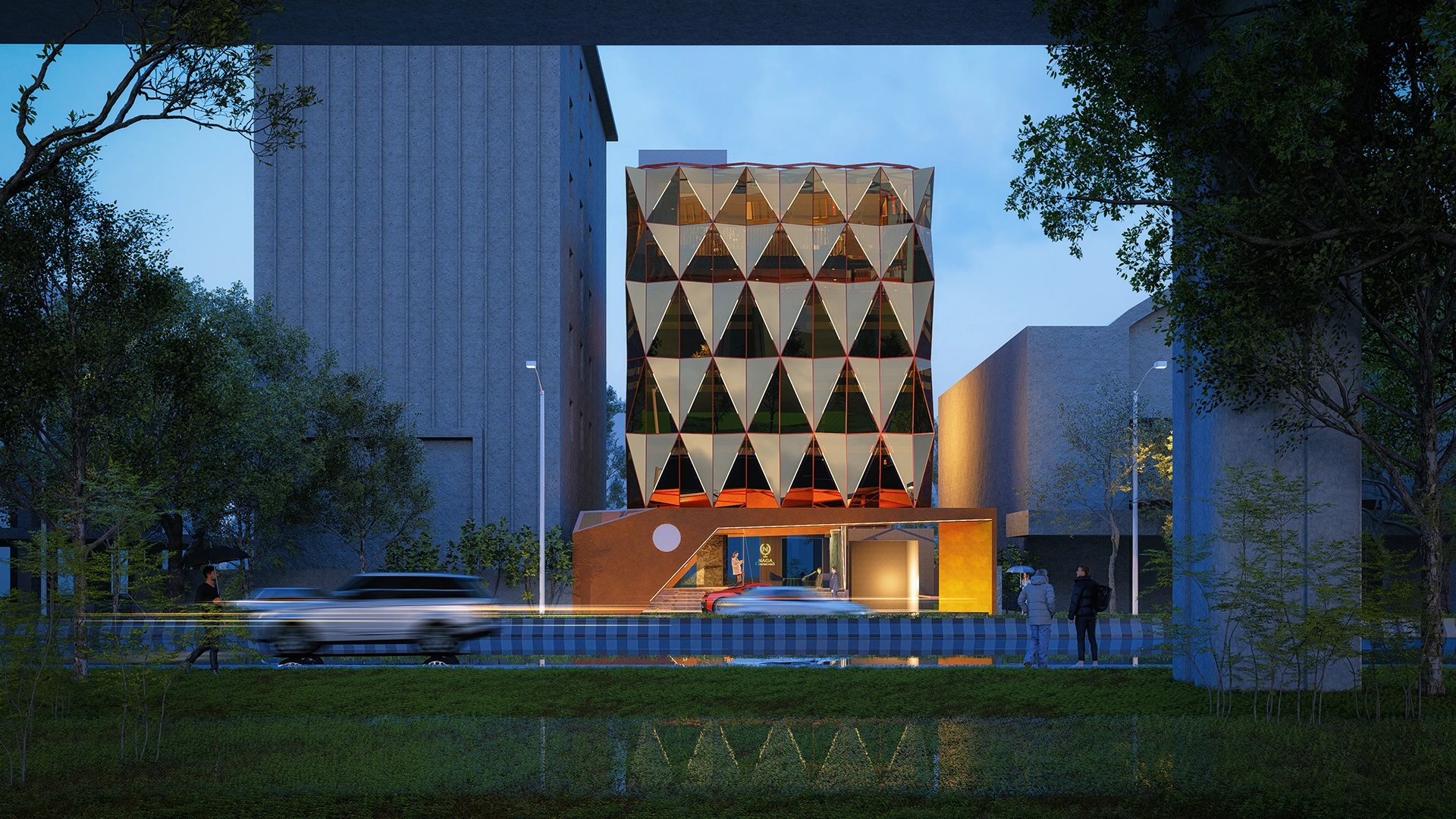 Situated near the iconic ISKCON temple, it benefits from excellent visibility both from the bustling street below and the elevated metro flyover above. This prime location inspired a façade design that captures attention—a folded glass origami structure that wraps around the building, creating a dynamic and sculptural shield for the suite rooms facing the street. This innovative glass façade not only adds visual interest but also provides privacy and light control for the rooms.