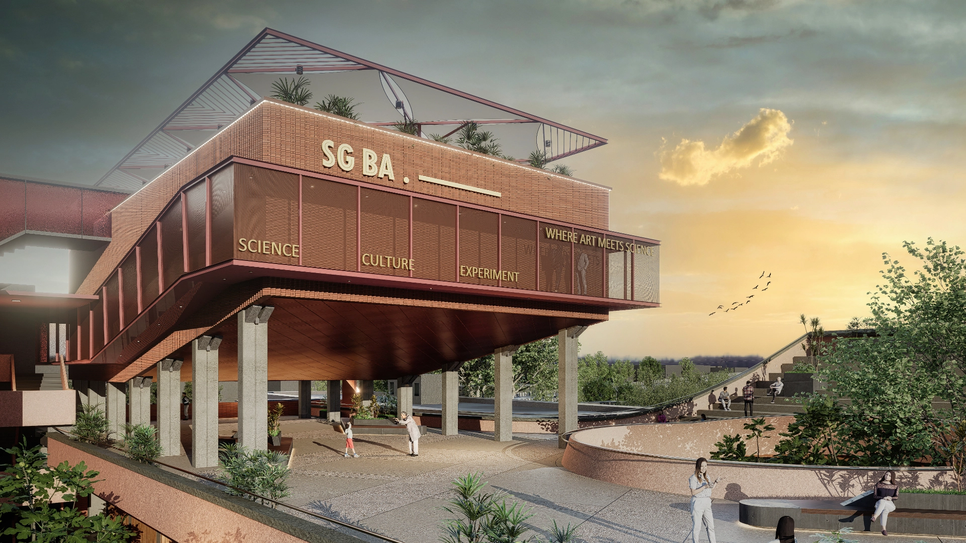 The gallery extension, located at the lower ground level, strengthens connectivity with the existing core, while the auditorium, elevated above the podium, defines a versatile event space beneath. Crowned by a sky lounge, the structure becomes a visual landmark, bridging the existing and future phases of the gallery and embodying the spirit of dialogue between science, art, and the public.