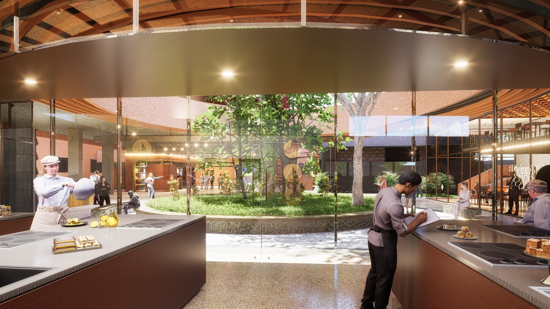 A large podium structure forms the foundation of this vision, expanding public areas and integrating the site’s existing tree into a central courtyard. This court opens seamlessly into a café and a series of interactive spaces, creating a lively interface between the building and its visitors.