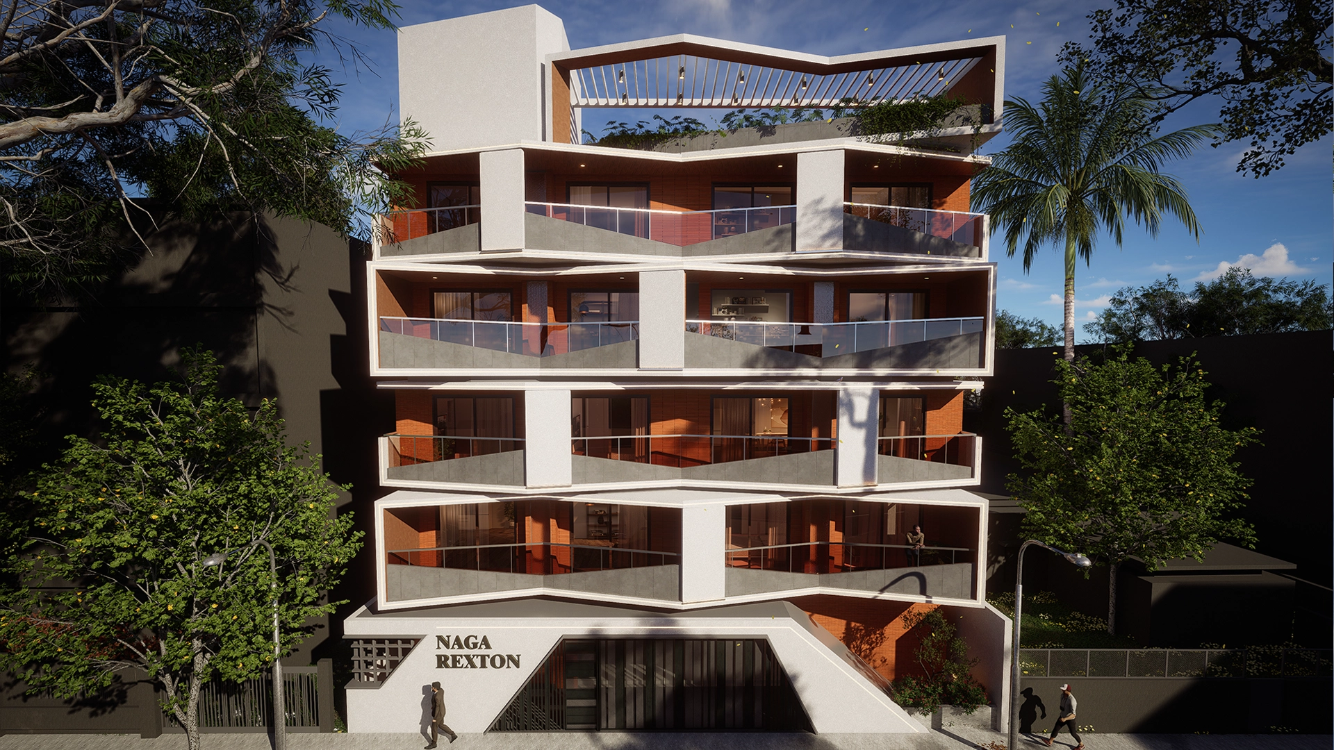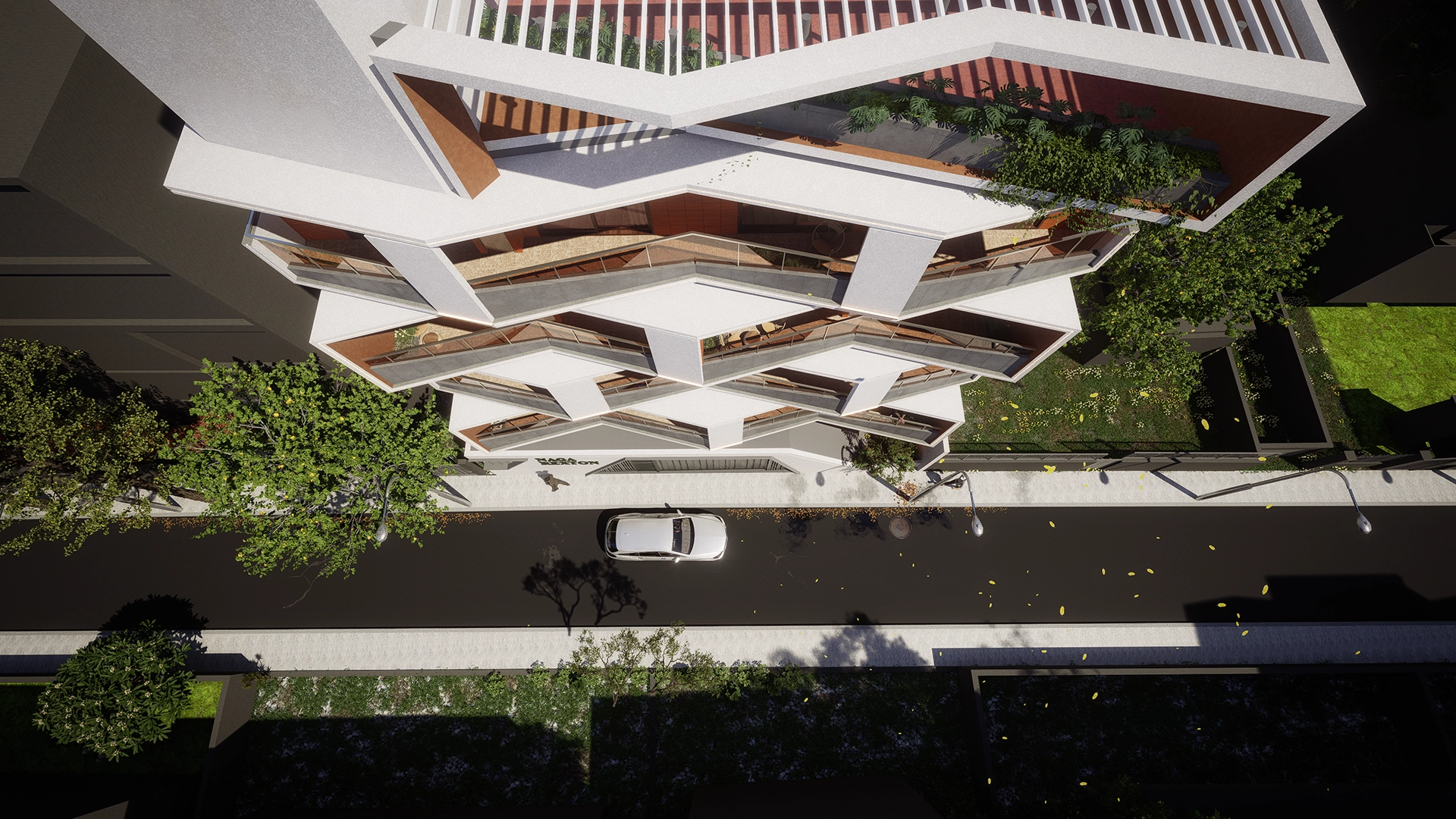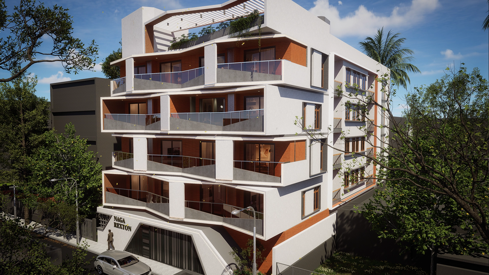 To heighten this visual movement, clean white RCC lines frame the structure, housing bold accent colors that add contrast and depth—bringing the whole composition to life. These sharp lines create a dynamic interplay of light and shadow throughout the day, emphasizing the building’s sculptural quality.