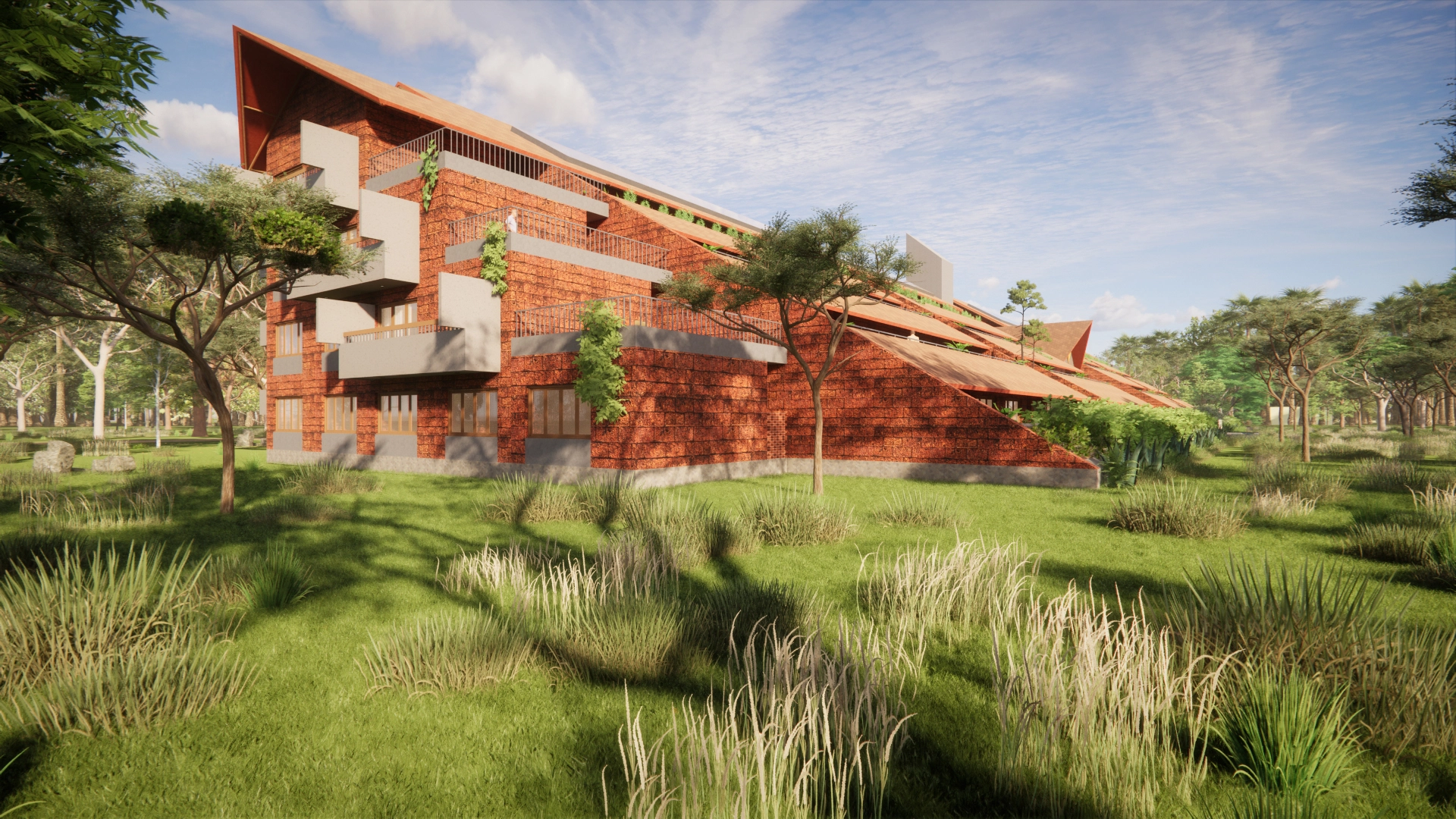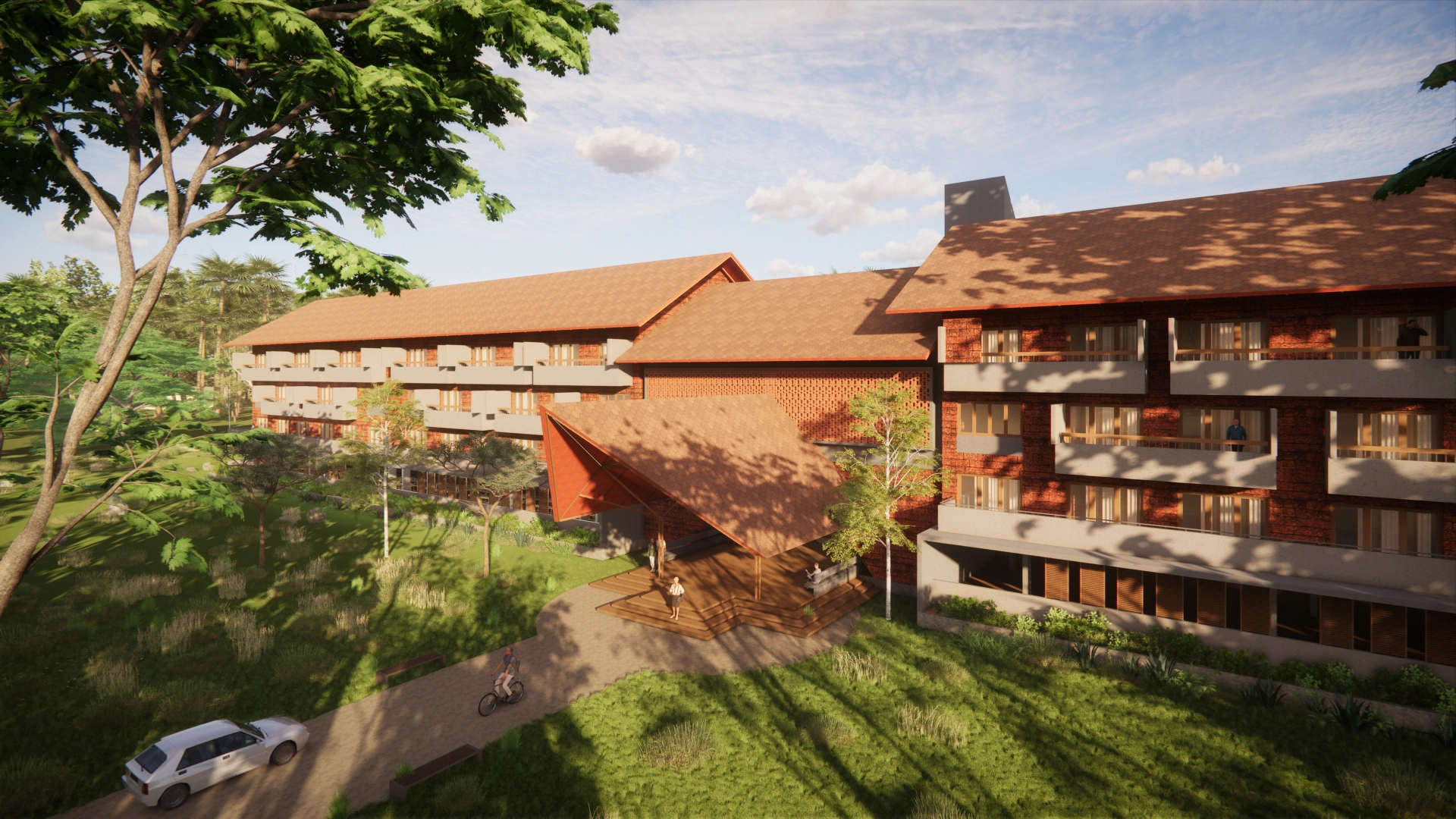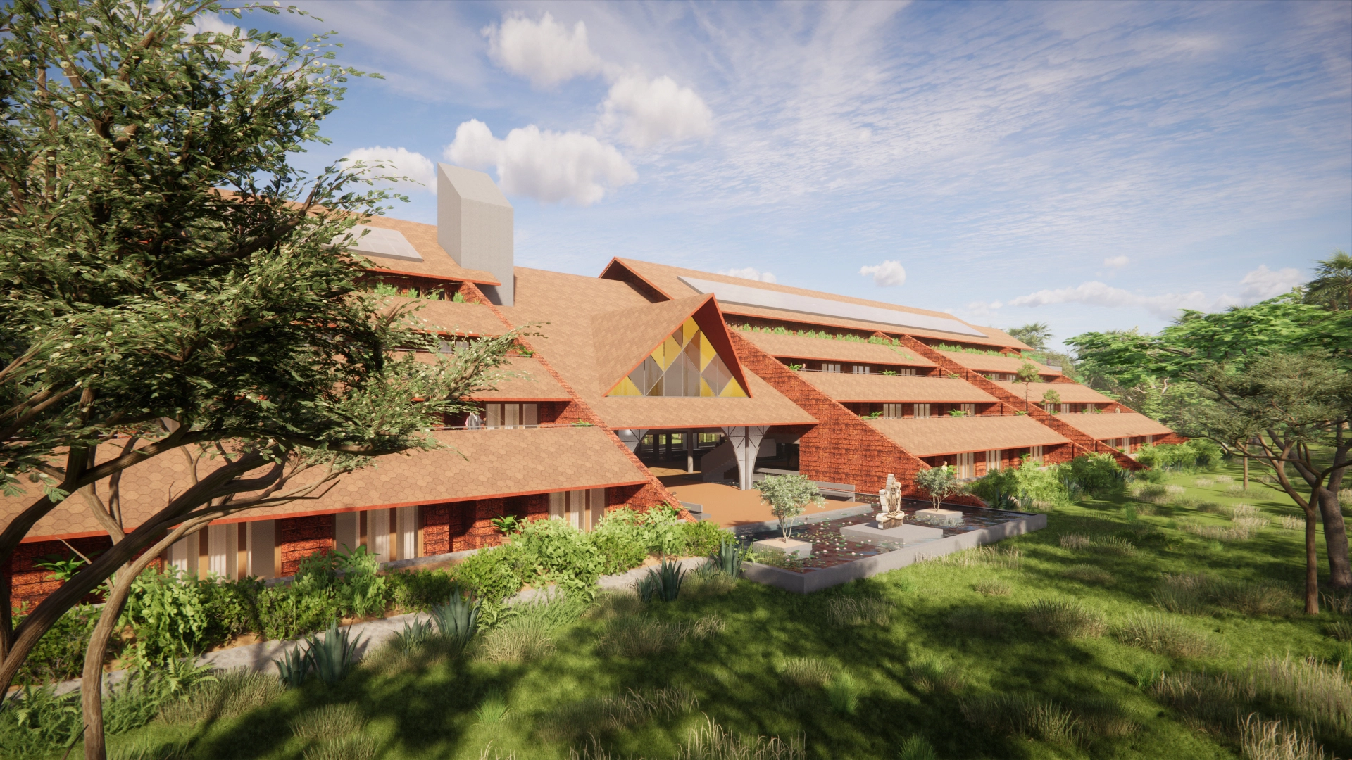 Drawing inspiration from local architectural traditions, the design carefully responds to the region’s climate, blending traditional elements with a modern expression. This balance respects cultural heritage while providing contemporary comfort. Every room is designed to open outwards, offering peaceful views of the surrounding greenery and encouraging a strong indoor-outdoor relationship.